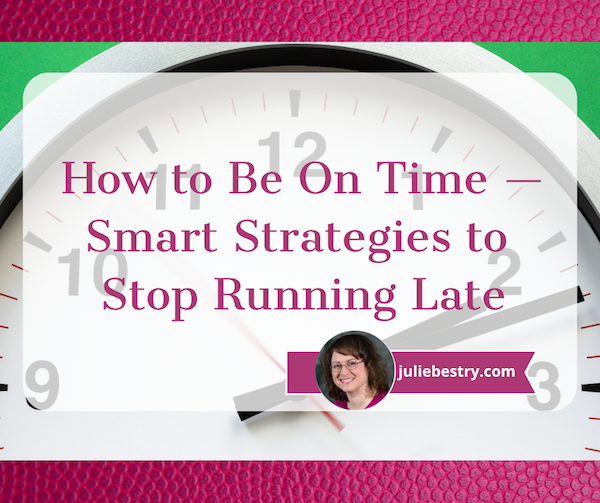 Being on time is no moral victory. (Nor is being late a moral failing.) But to be a good role model for clients regarding organizing and productivity, I need to walk the talk, and time management — particularly arriving on time — is important. It’s also doable!